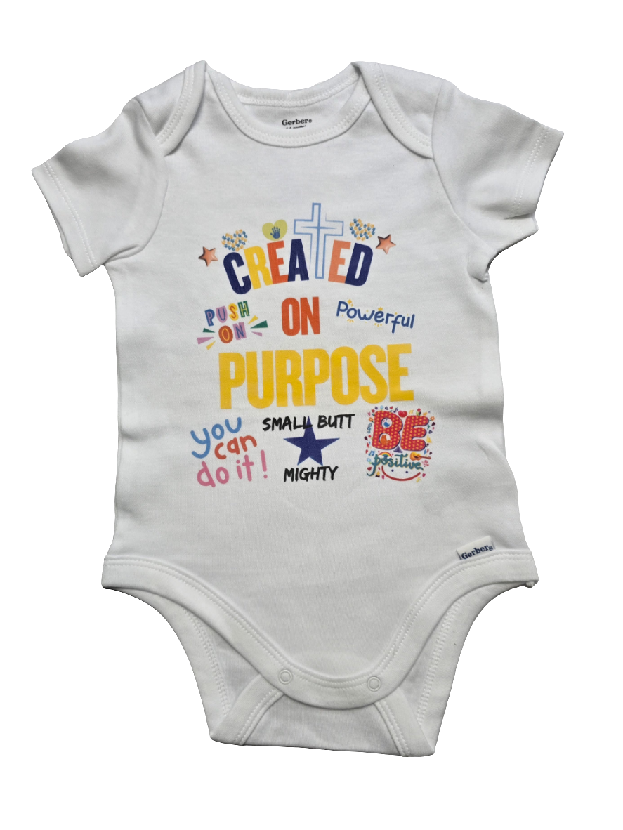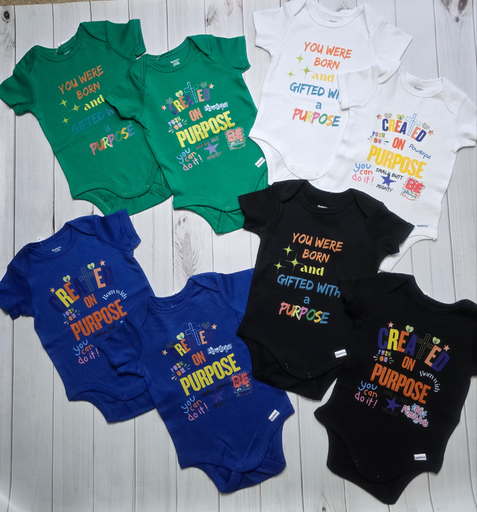 “CreaTed On Purpose babies is soft, cozy, and full of color — because even the tiniest ones were made with a big purpose! Every little onesie, outfit shares love, joy, and a message that your baby was born to shine.”