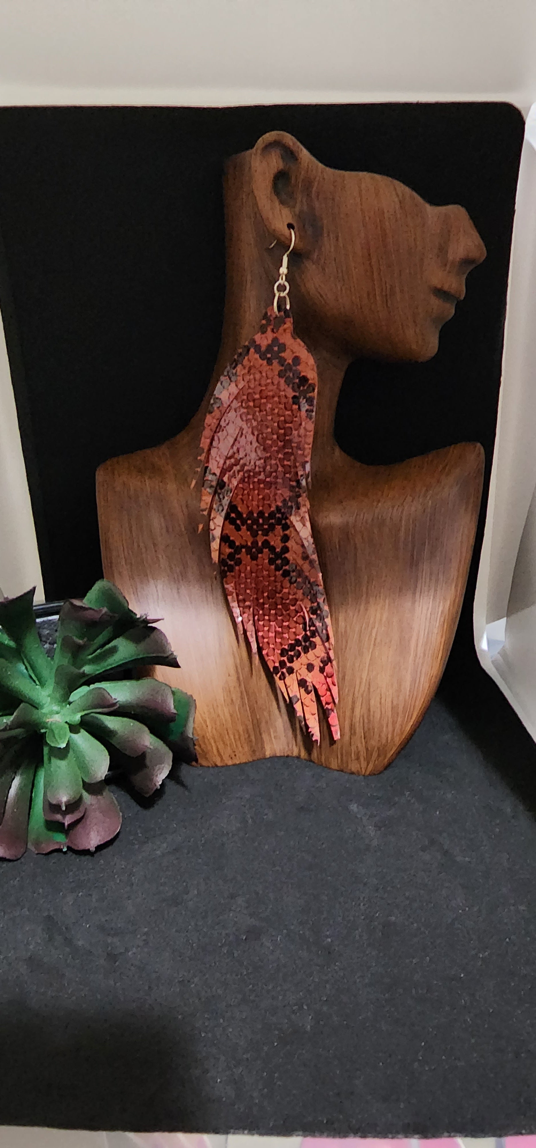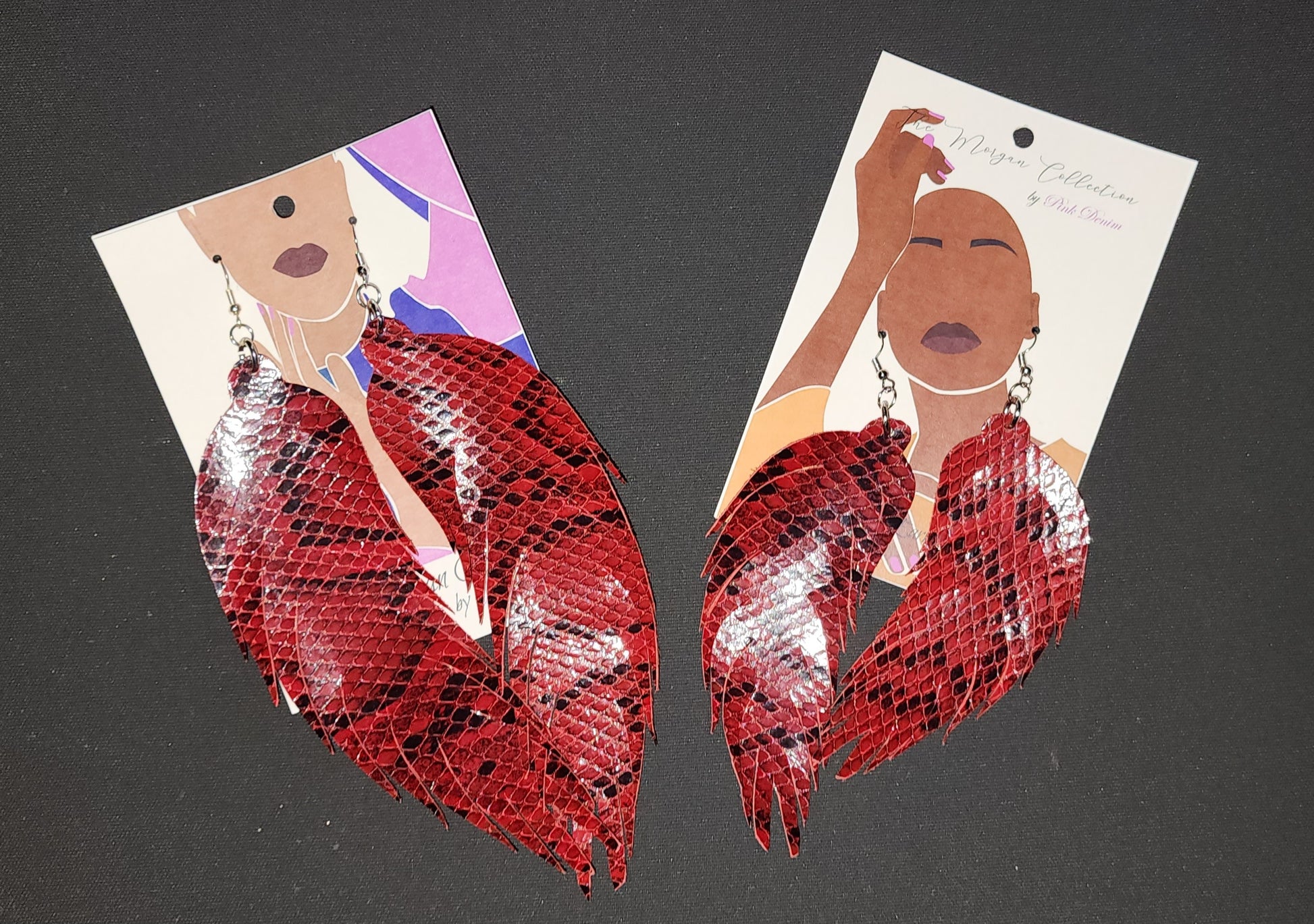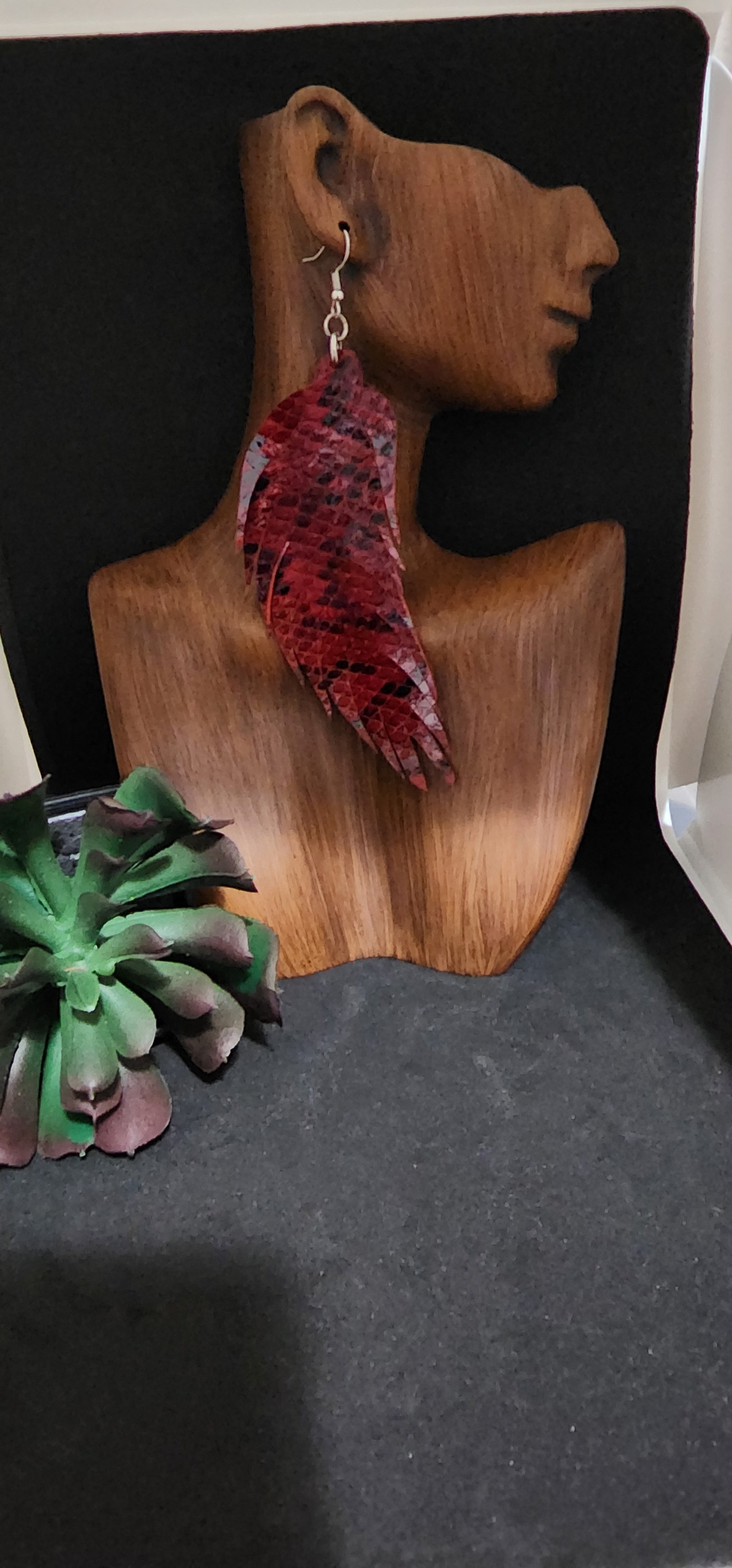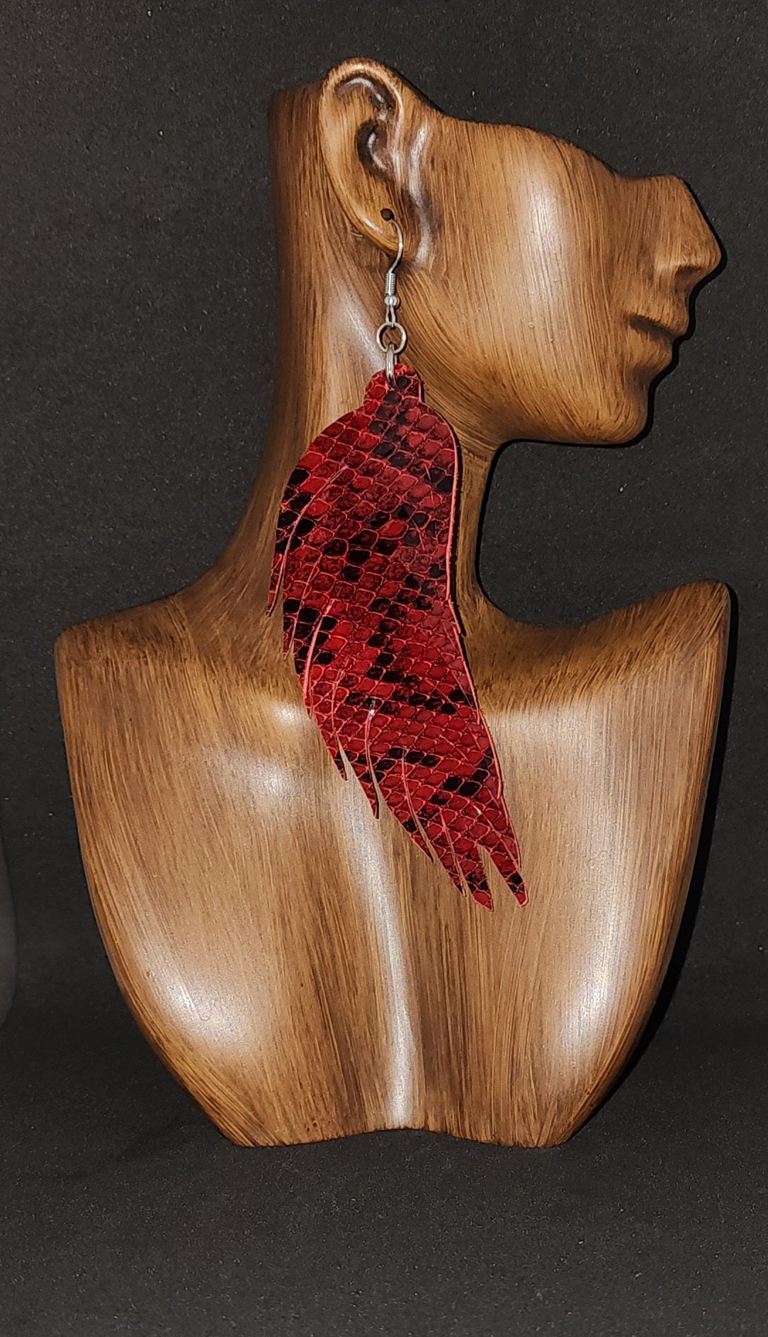 Handmade, cut and designed by our team. These Red Snake Skin genuine leather feather earrings are very light weight and a great statement piece to any outfit. Made of genuine leather and hypoallergenic hooks. Choose from 4" or 6"