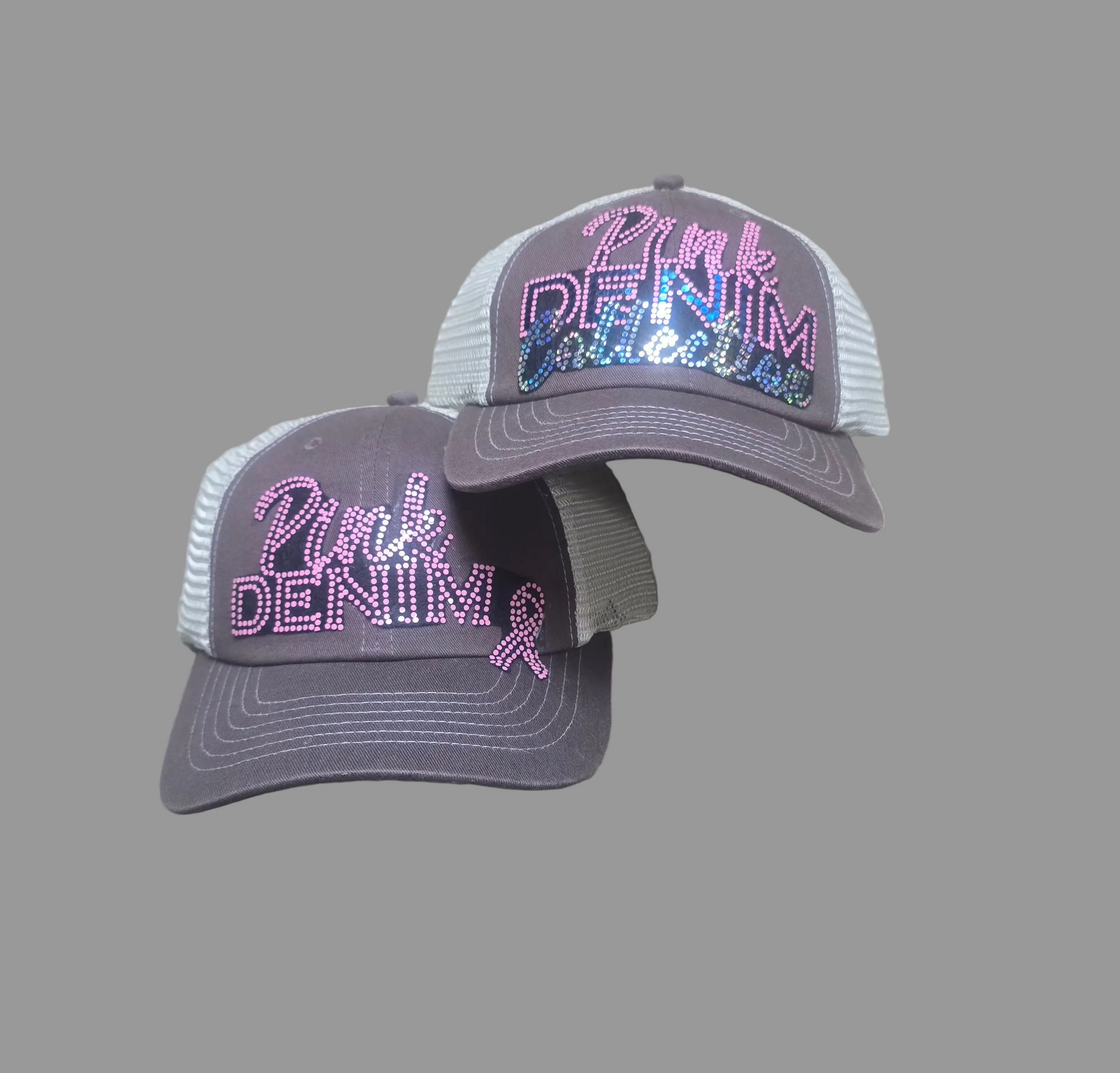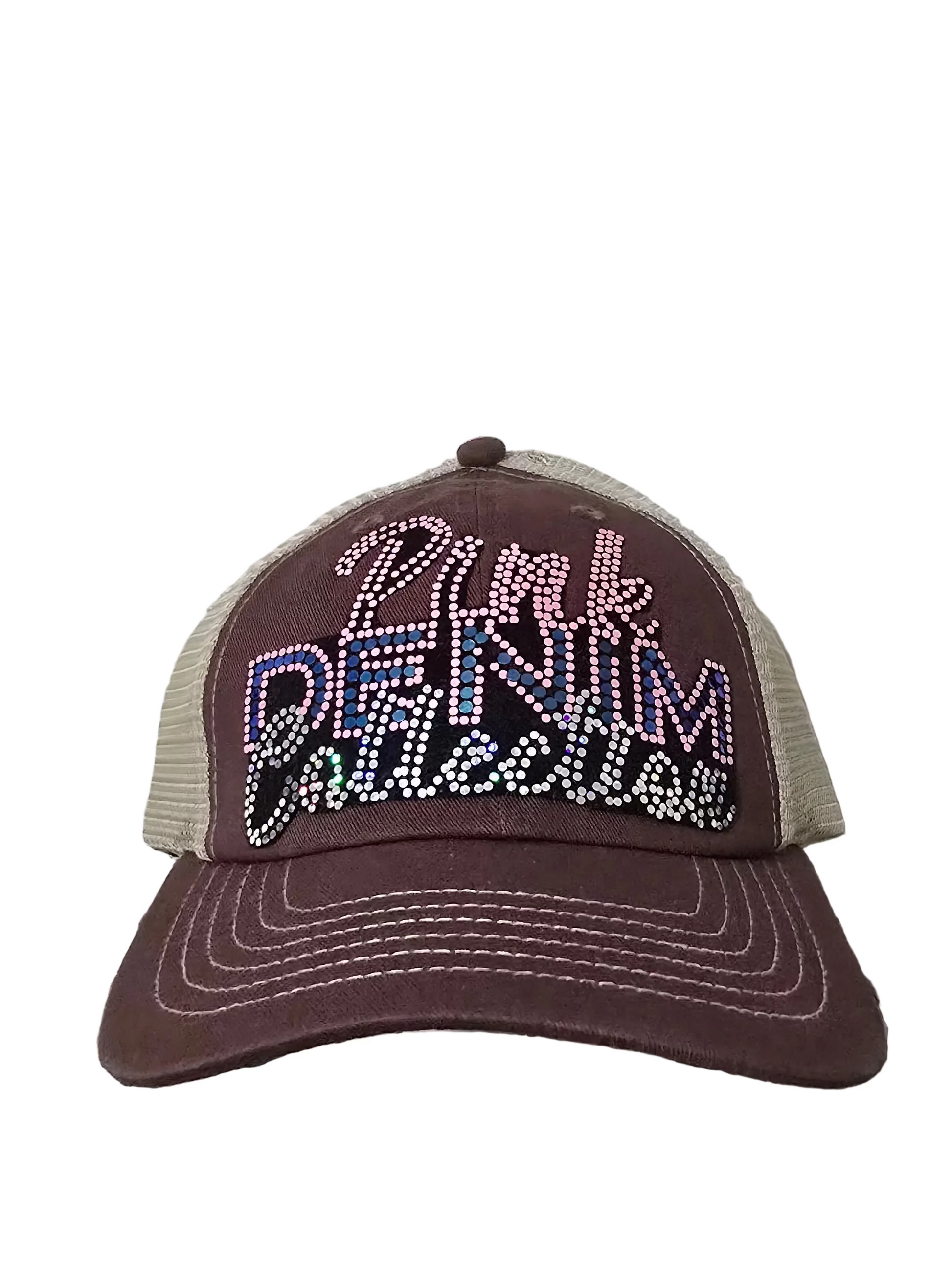 Pink Denim's chocolate Trucker Hats with bling patches on the front, mesh material in the back will make a great fit to your wadrobe. 100% cotton on the front panel & visor; 100% nylon mesh back panels with plastic adjustable band. • Traditional nylon mesh back panels are always tan • Distressed torn visor • Cotton twill sweatband • Matching color plastic tab back closure